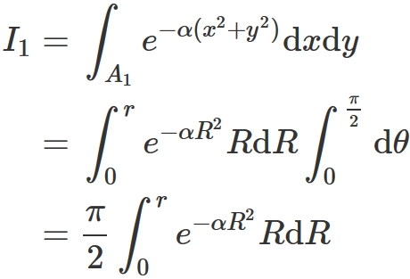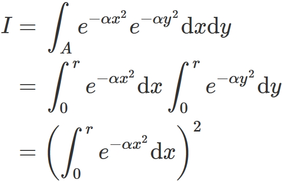 Let $I_{1}$, $I$, and $I_{2}$ be an integral of $e^{-\alpha (x^{2}+ y^{2})}$ over $A_{1}$, $A$, and $A_{2}$, respectively, i.e.,